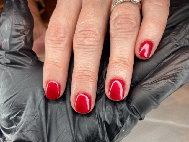 Nails are cut, filed, shaped and cuticles are cut. The result of this process is a strong, OPI glossy gel finish that is chip free and lasts up two weeks.